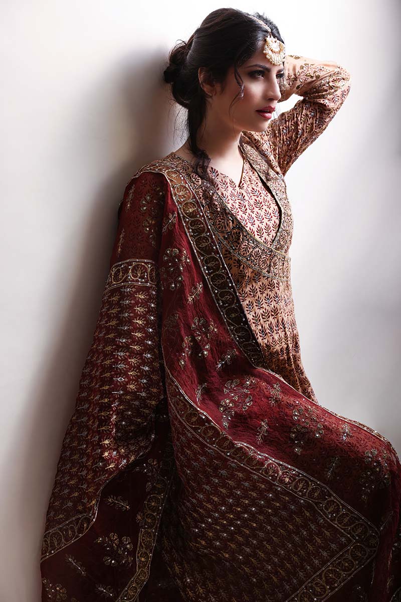 Pale Copper Hand Blocked Cotton Lawn Angarkha with Tilla, Gota, Mirrors & Sequins