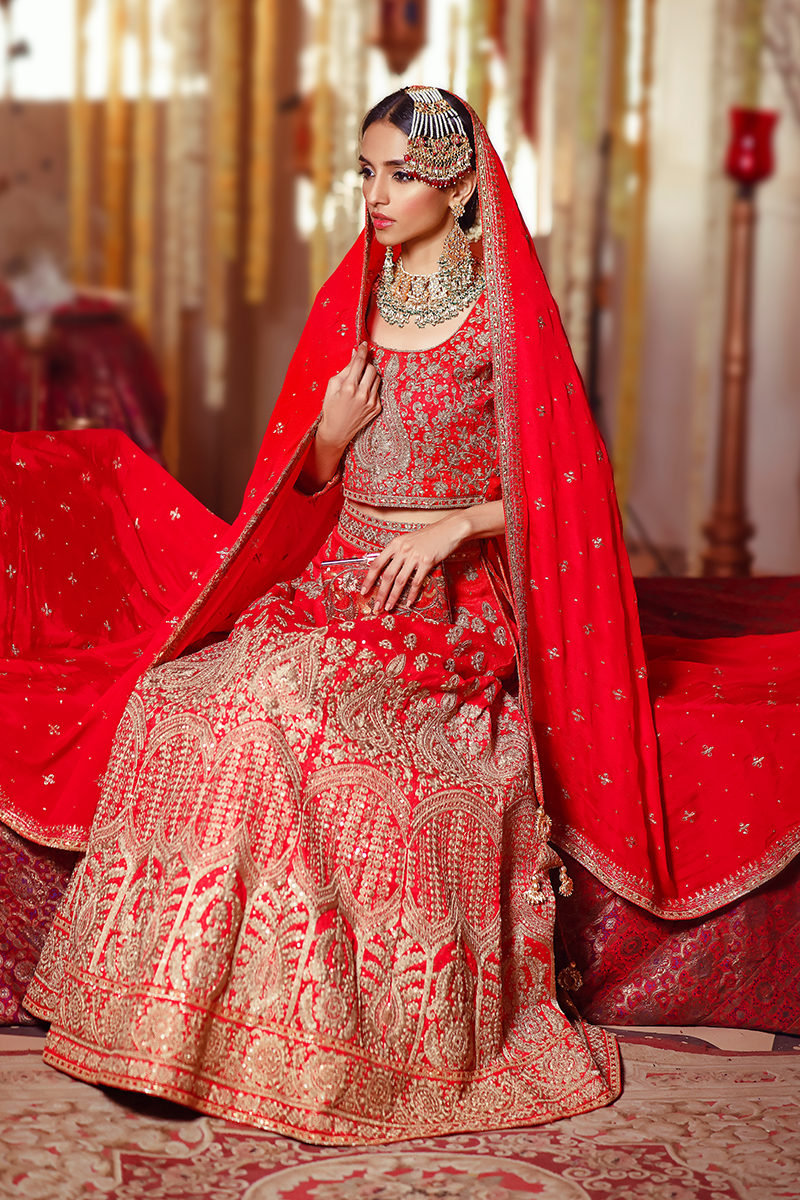 Deep red lehnga choli intricately worked with dull gold marori and sequins work paired with long duppatta
